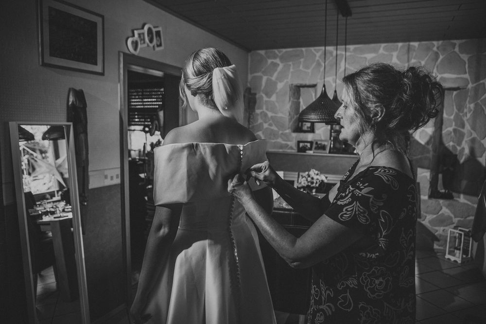 Der Tag begann mit dem Getting-Ready der Braut – ein intimer Moment voller Vorfreude und Aufregung. Umgeben von ihren besten Freundinnen, die in liebevoll abgestimmten Morgenmänteln Sekt anstießen, bereitete sich die Braut auf ihren großen Moment vor. Besonders emotional wurde es, als ihre Mutter ihr half, das Brautkleid anzuziehen – ein Augenblick voller Nähe und Verbundenheit, den ich mit viel Feingefühl festgehalten habe.